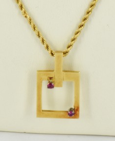 twisted rope design (length closed 30cm). Together with an 18ct yellow gold pendant, inset with two brilliant round cut synthetic rubies. Total weight 14.3g. -