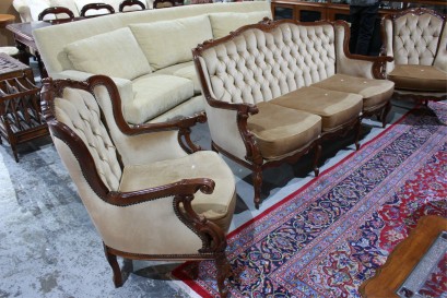 carved walnut frame, button back velour upholstery, comprising of 1 x 3-seater, 2 x armchairs and 2 x salon chairs -