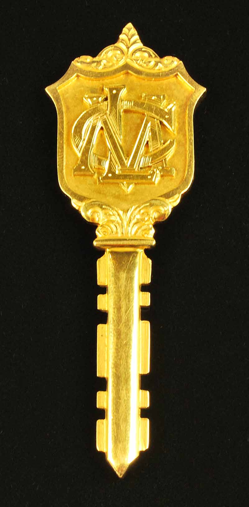15ct Gold, by Levinson's Perth. Engraved: 'Presented to the Hon. Sir James Mitchell K.C.M.G. Opening of the C.M.L. Building Perth 26-10-36'. Length: 8.2cm; Weight: 32gm -