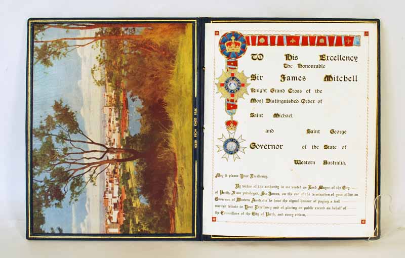 Presented to Sir James Mitchell Inscribed: 'To His Excellency The Honourable Sir James Mitchell Knights Grand Cross of the Most Distinguished Order of Saint Michael and Saint George Governor of the State of Western Australia...from the good wishes of the City of Perth and people of Western Australia at the end of his term as Governor of WA. 29th June 1951'. 28 x 27cm -