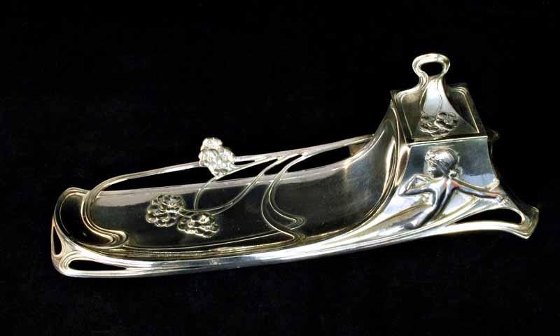 Notes:W.M.F. is short for Wurttembergische Metallwarenfabrik. Founded in 1880 by the merger of two German companies. The firm became famous for its art nouveau metal wares. Their in-house design studio was directed from 1894 by the sculptor and designer Albert Mayer. The style was similar to the French art nouveau style with sinuous curves, maidens in robes, nymphs and motifs from nature. In Germany, this design style became known as “Jugendstil”. The decorative pieces of WMF today are keenly collected worldwide.