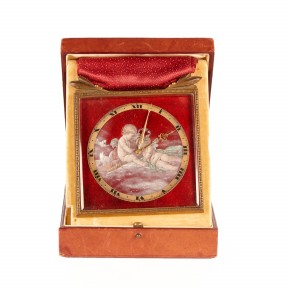 Red enamel dial with a raised chapter ring with black numerals on a gilt ground. The centre decorated with raised enamel work depicting two putti resting on a cloud with doves. Signed ‘Richay’ Stamped ‘Chevron a la Emeraude, Nice- Lausanne’. Attached ribbon for hanging, complete with tted leather base and wall bracket.