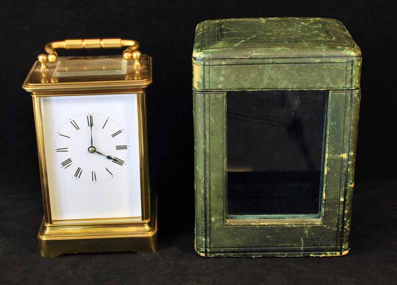 Late 19th century, likely FrenchIn fitted leather case. With half and hourly bell striker. Height: 23cm -