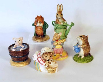 Various backstamps, manufactured England. Timmy Willie, Yock-Yock in the tub, Peter in the watering can, The Head Gardener, Johnny Town Mouse, Mrs Tiggy-Winkle washing. Heights: 7.2cm- 12.2cm. (6) -