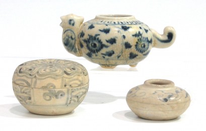 Lot Description:An Underglaze Blue Water Dropper, a Zoomorphic Figure, a Lidded Box & a Jarlet, Vietnam 13-15th Century