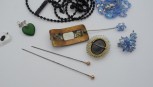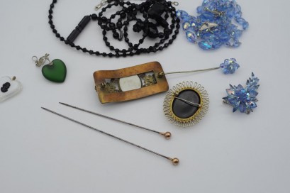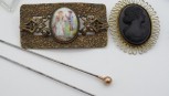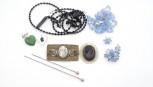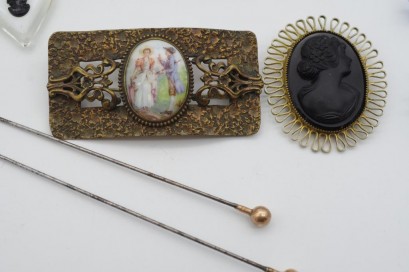 includes a cameo brooch, an antique painted ceramic and bronze/copper brooch, hat pins, glass pendants and beaded necklaces. -