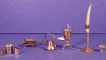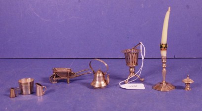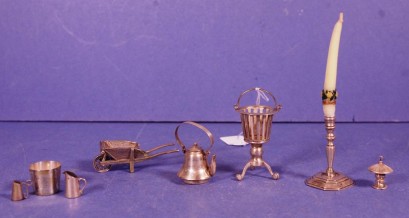 including a candlestick, (height 5cm approx); a tri-footed basket; a kettle; wheelbarrow; 2 graduated ewers; a bucket; and a roofed shrine. Weight 88grams approx (total). -