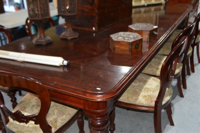 dining table, on 5 fluted legs, comes with 3 extension leaves, can be used in 4 configurations, length fully extended is 294cm, 121cm W, some staining to one extension leaf -