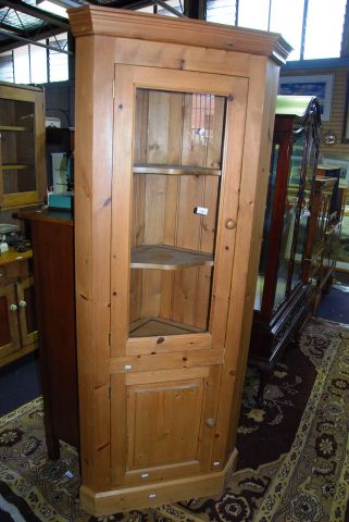 Lot Description:Tall pine corner cupboard, glazed upper door