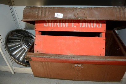 plus an original stencilled painted Sharpe Bros bottle crate and an old Ford hubcap -