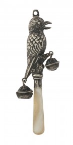 Lot Description:A baby's rattle in the form of a kookaburra with gumnut bells, sterling silver and mother of pearl