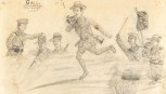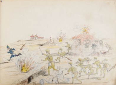 containing drawings in pencil and ink, with loose sheets, one book signed and dated "1st June 1916" in ink inside front cover, many drawings captioned, some dated or signed, 25 x 34cm (approx. each book). Cover and some pages loose in one book, wear to edges of pages, stains, soiling and foxing overall. Drawings include battle scenes such as one captioned "The Landing at Gallipoli", maps of European countries, images of battleships, as well as portraits of soldiers, school mates, family and other figures, caricatures, a partial cartoon strip, illustrations to a story with accompanying text written on loose pages, and images of political and military figures cut from newspapers. Various captions and annotations indicate that Alec Wood attended St Dunstan's College, on the outskirts of London, UK, but had ties to Australia, and possibly spent some time in France. -