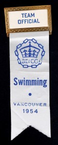 "TEAM OFFICIAL", with white ribbon printed "SWIMMING/VANCOUVER 1954". -