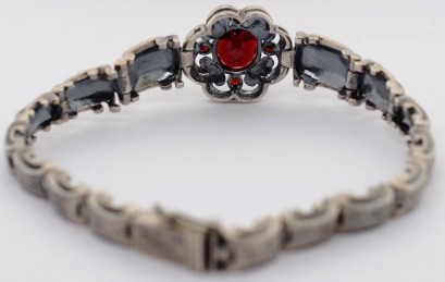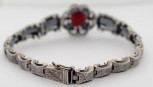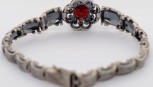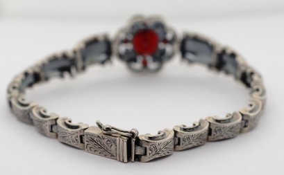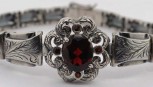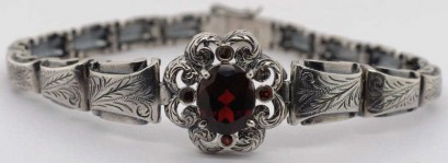 with engraved sterling silver links and central approx 11mm x 8.6mm oval cut garnet, set in a a scroll work setting. Marked 925 approx 21 grams, 19.5cm length. -