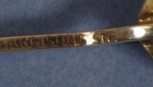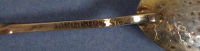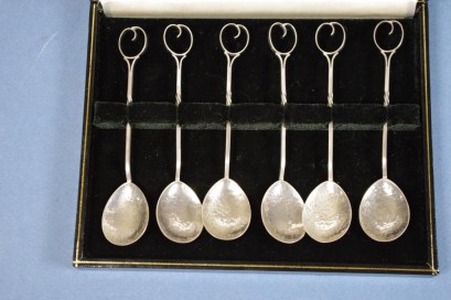 6 spoons, decorated finials to hand beaten bowls. Length 11cm approx (each). Weight 50grams approx (total). -