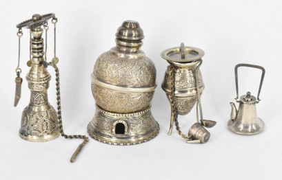 including a miniature bottle after 1946, 900 silver Cairo, raised on a silver plated base, a 900 silver tripod vase, and miniature Nargile, after 1946. -