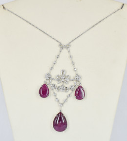 pear shaped cabochon cut African rubies of 46.69ct in total, surmounted by 1.25ct of diamonds all set in 18ct white gold. Total weight 25.3g. -
