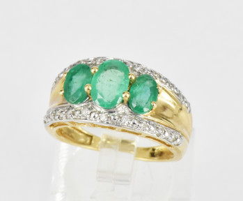 featuring three oval cut emeralds, surrounded by diamonds, in 14ct yellow gold (stamped). Size L-M. Weight 4.3g. -