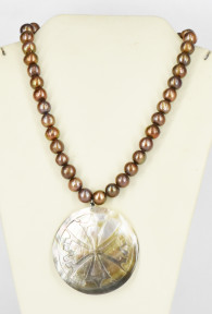 featuring a central mother-of-pearl shell with cultured pearls and gilded silver clasp. Length 26cm. -