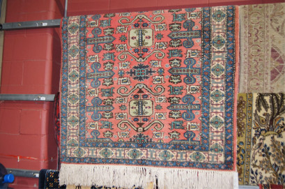 pink ground, blue green & cream geometric decoration, 187 x 124cm, note: not a perfect rectangular, rustic tribal made -