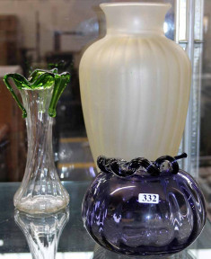 purple pumpkin form, flair form clear with green rim and satin glass baluster form. Height 32 - 14cm. -
