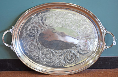 oval shaped, double handles, lightly engraved with floral design, raised on four half-ball feet. Width 73cm. -