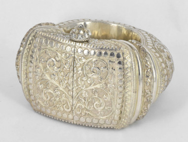 also called Nizwa anklet. The inside is rounded and the outside is well decorated with foliate panels, central hinge with bolt. Total weight 407g. -