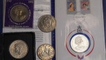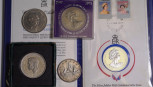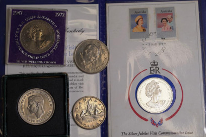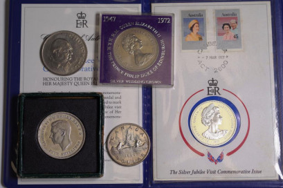 including boxed Festival of Britain, 1951; Australian 1977 Royal Visit, in presentation wallet; UK 1972 Silver Wedding crown; Canadian 1959 dollar coin; and UK 1965 Churchill coin. -