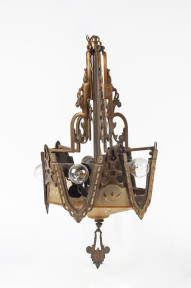 Lot Description:A brass and etched glass five light chandelier, early 20th century