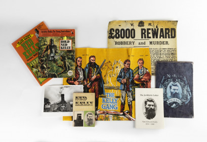 Souvenir Programme Ned Kelly's Last Stand Glenrow+B43:B55an 28 - 29/6/80 Brochure/Book n- The Jerilderie Letter 2000 Souvenir Programme Ned Kelly's Last Stand Glenrowan 28 - 29/6/80 Small book - The Kelly Gang by E. A Straughair (no date) The Kelly Gang tea towel Book - Ned Kelly, the legend and the man by M J Jennings 1968 Book - Bold Ned Kelly Activity Book 1977 Book - A Pictorial history of Jerilderie (no date) Book - Background of Beechworth 1972 Photo - "John Kelly house, Beveridge" dated: 1992 Book - Redmond Barry, A colonial Life by Peter Ryan 1980 Framed print of Ned Kelly "Bare knuckle boxing 1874" 4 x scrap books of newspaper cuttings etc. -