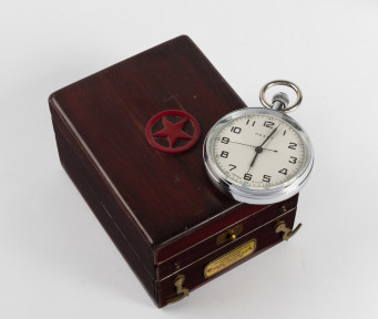 22 jewel movement, nickel chrome case, silvered dial with black numerals and black hands, signed dial movement, inscribed Moscow Boat Factory, Them C.M. Kirov, Clock Factory, That 25-07.1510-83 in fitted box