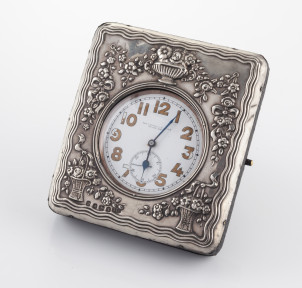 15 jewel movement, white enamel dial with illuminated Arabic numerals, blue steel hands and subsidiary seconds at 6, Retailed by The Fenchurch Lever in original box with repousse silver face