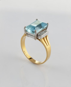 four claw set with a central rectangular aquamarine of estimated weight 5.66 carats, and chanel set either side with three baguette diamonds. 18ct yellow gold. Weight 8.26 grams. Size U. -