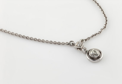 bezel set with a central brilliant cut diamond of estimated weight 0.20 carat, and hung on a fine tracelink chain. 18ct white gold. Weight 2.63 grams. Length 39cm.