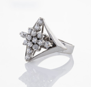 set with sixteen modern brilliant cut diamonds of total estimated weight 0.80 carat. 18ct white gold. Weight 8.29 grams. Size O. -