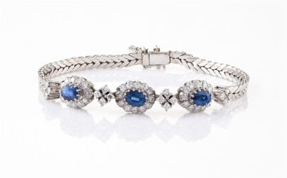 the front section comprising three oval sapphire and diamond clusters, each spaced by diamond set motif. Estimated total diamond weight 3 carats. Estimated total weight of fifty brilliant cut diamonds 1.12 carats. 14ct white gold. Weight 21.67 grams. Length 18cm. -