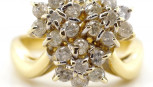 approx 21x round diamonds set in a three flower arrangement. Marked K14 approx 5.4 grams weight, ring size L. -