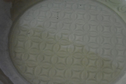 with barbed rim, interior decorated with central floral lattice encircled by a band of lotus scrolls, base with exposed burnt orange body, 7 cm H, 36.5 cm Dia -