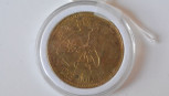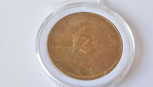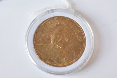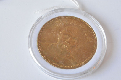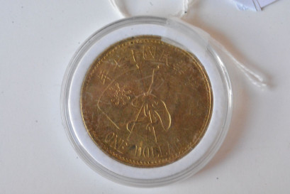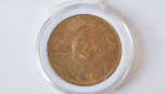 front with bust of an elderly man, back with two flags and words "ONE DOLLAR" , perspex case, 3.8 cm Dia -