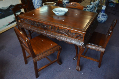 well carved detail, rectangular form table with splayed apron, cabriolet legs, with a set of 4 matching dining chairs, table measures 128cm L x 90cm W -