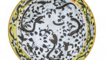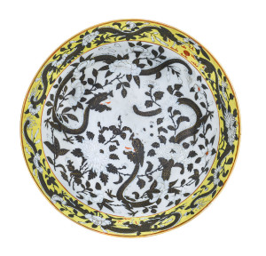 Lot Description:A fine Chinese porcelain bowl decorated with dragons amidst floral motif, glazed in Imperial yellow and turquoise ground, 19th century
