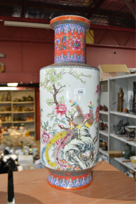 polychrome glaze with bird and floral detail and calligraphy verso, and gilt character marks, has red characters to underside, 57cm T -
