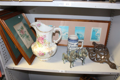 water jug, blue & white Delft style tankard, pair of bronze style Indonesian figures on horseback and cast iron trivett -