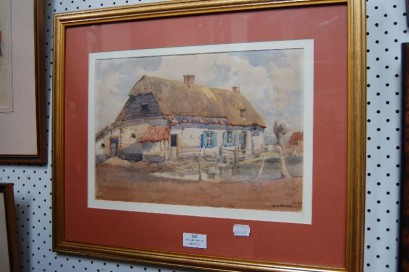 A framed watercolour of an army billet in France, thought to be the temporary home of the artist