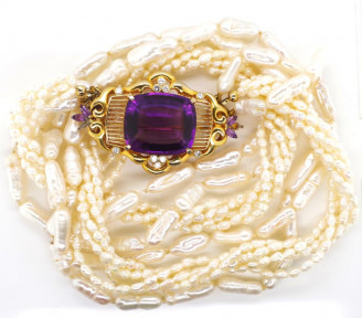Lot #107 - 18ct gold, amethyst, diamond and pearl necklace