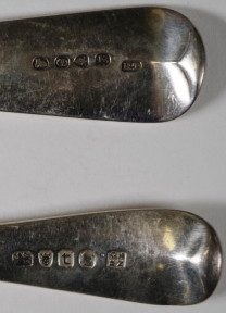 one hallmarked London 1794, maker: Thomas Northcote & George Bourne, the other hallmarked London 1813, maker: Richard Turner, both with monogrammed handles, 130 grams approx -