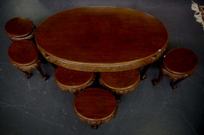 comprising of an oval table and 6 stools, all with carved aprons and ball claw feet, 126cm x 71cm, 52cm high -