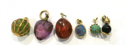 Lot Description:Three Gold Pendants & Two Gold Plated Pendants with Amber, Turquoise, Onyx & Amethyst