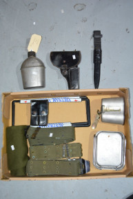 canteen, food containers, bayonet sheath, leather pistol holster -