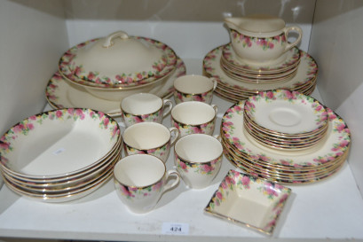 extras incl 6 teacups and saucers, 7 side plates, 6 entree plates, 6 dinner plates, 6 soup bowls, a lidded turine, an oval serving platter, a sauce jug and a jam/butter dish -